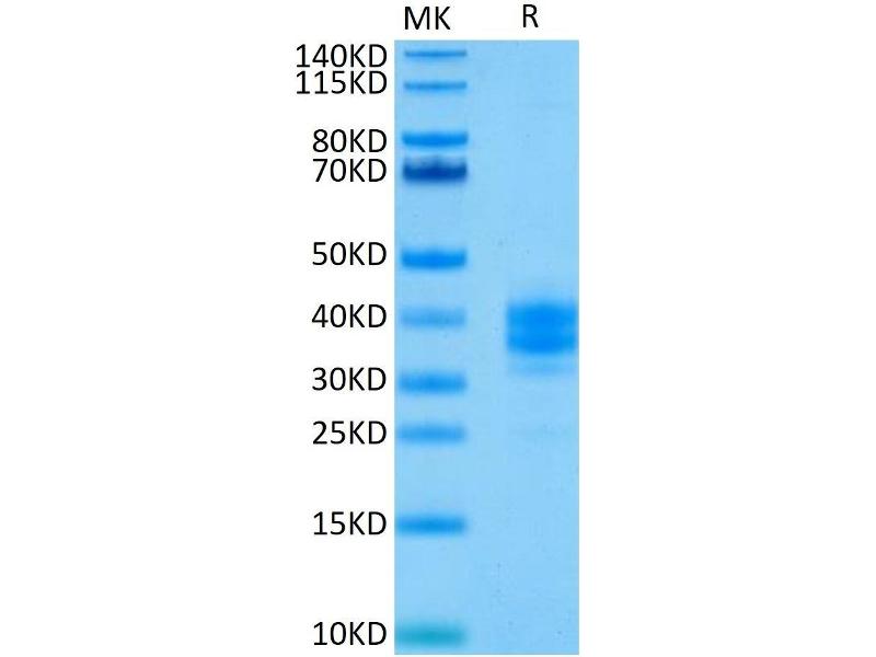 - 28.2 kDa. Due to glycosylation, the protein migrates to 30-45 kDa based on Tris-Bis PAGE result.
