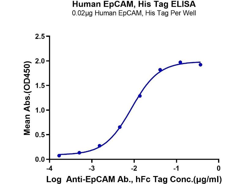 - Immobilized Human EpCAM, His Tag at 0.2μg/ml (100μl/Well). Dose response curve for Anti-EpCAM Antibody, hFc Tag with the EC50 of 8.7ng/ml determined by ELISA. See testing image for detail.