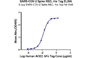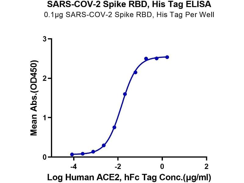 - Immobilized SARS-COV-2 Spike RBD, His Tag at 1μg/ml (100μl/Well) on the plate. Dose response curve for Human ACE2, hFc Tag with the EC50 of 14.5ng/ml determined by ELISA. The affinity constant of 13.8nM as determined in SPR assay (Biacore T200). See testing image for detail.