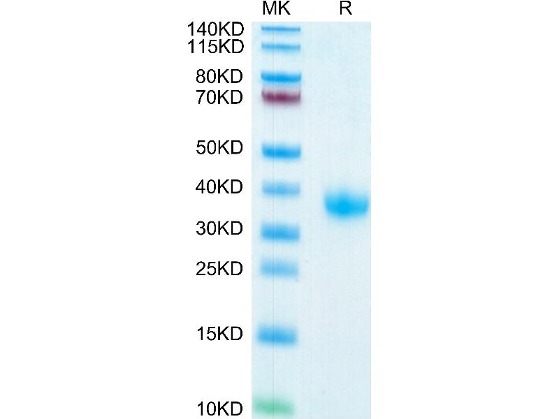 - 27 kDa. Due to glycosylation, the protein migrates to 36-40 kDa based on Tris-Bis PAGE result.