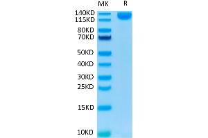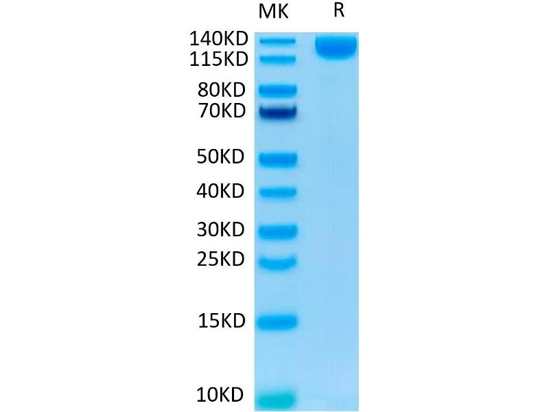 - 102.6 kDa. Due to glycosylation, the protein migrates to 130-140 kDa based on Tris-Bis PAGE result.