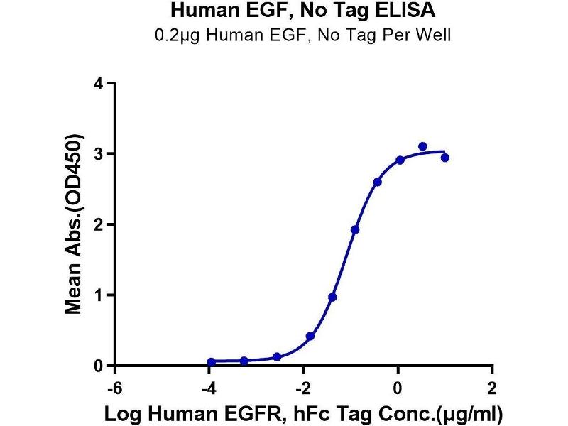 - Immobilized Human EGF at 2μg/ml (100μl/well) on the plate. Dose response curve for Human EGFR, hFc Tag with the EC50 of 81.0ng/ml determined by ELISA. The affinity constant of 0.05 nM as determined in SPR assay (Biacore T200). See testing image for detail.