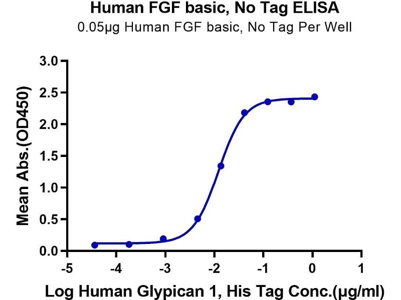 - Immobilized Human FGF basic at 0.5μg/ml (100μl/Well) on the plate. Dose response curve for Human Glypican 1, His Tag with the EC50 of 12.3ng/ml determined by ELISA. See testing image for detail.