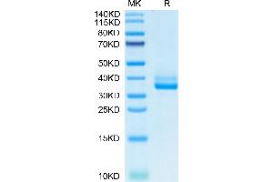 - 28.2 kDa. Due to glycosylation, the protein migrates to 30-40 kDa based on Tris-Bis PAGE result.