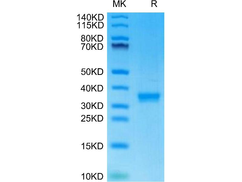 - 26.10 kDa. Due to glycosylation, the protein migrates to 30-40 kDa based on Tris-Bis PAGE result.