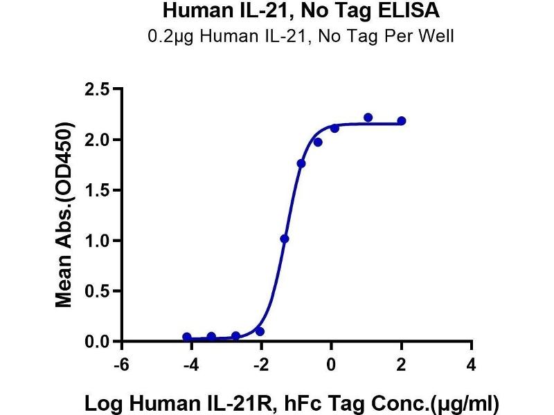- Immobilized Human IL-21, No Tag at 1μg/ml (100μl/well) on the plate. Dose response curve for Human IL-21R, hFc Tag with the EC50 of 63.6ng/ml determined by ELISA. See testing image for detail.