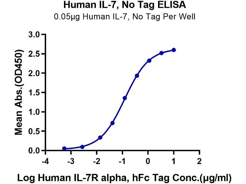 - Immobilized Human IL-7 at 2ug/ml (100ul/Well) on the plate. Dose response curve for Human IL-7R alpha, hFc Tag with the EC50 of 16.2ng/ml determined by ELISA (QC tested). The affinity constant of 7.15 nM as determined in SPR assay (Biacore T200). See testing image for detail.