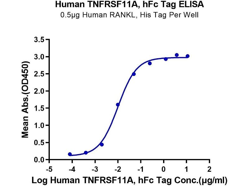- Immobilized Human RANKL, His Tag at 5μg/ml (100μl/well) on the plate. Dose response curve for Human TNFRSF11A, hFc Tag with the EC50 of 10.0ng/ml determined by ELISA. See testing image for detail.