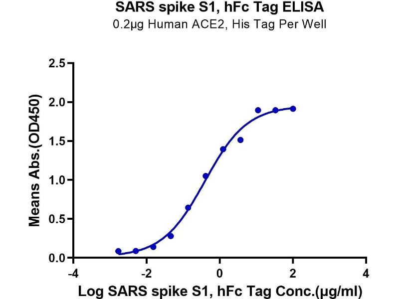 - Immobilized Human ACE2 at 2μg/ml (100μl/Well).Dose response curve for SARS Spike S1, hFc Tag with the EC50 of 0.39μg/ml determined by ELISA. See testing image for detail.