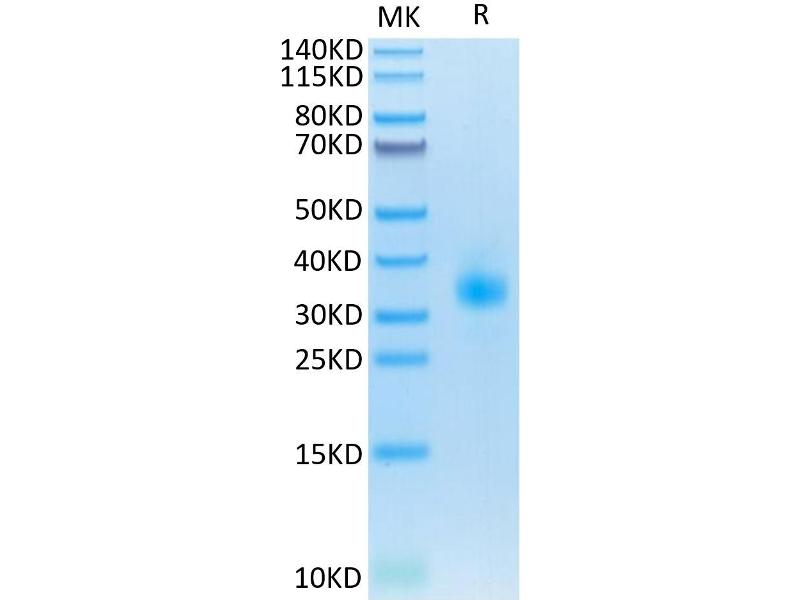 - 22 kDa. Due to glycosylation,the protein migrates to 30-40 kDa based on Tris-Bis PAGE result.