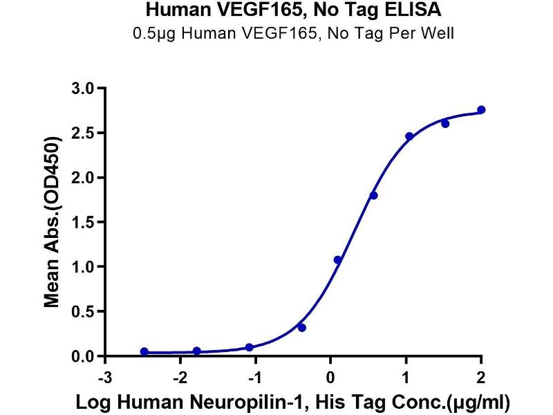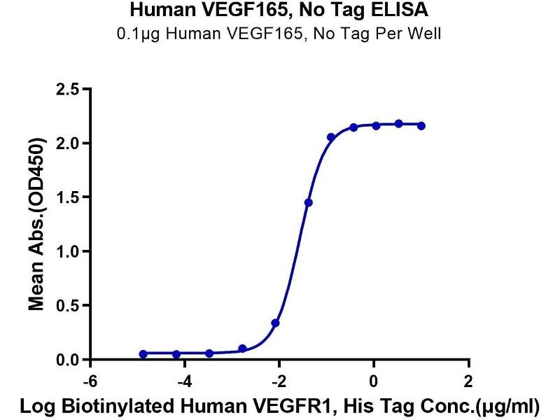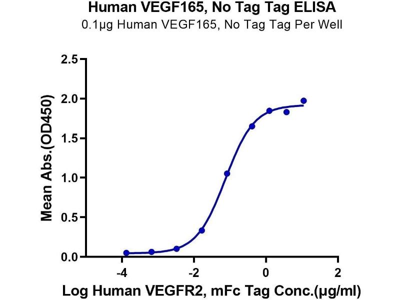 - Immobilized Human VEGF165 at 1μg/ml (100μl/well) on the plate. Dose response curve for Human VEGFR2, mFc Tag with the EC50 of 74.2ng/ml determined by ELISA. See testing image for detail.