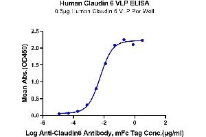 - Immobilized Human Claudin 6 VLP at 5μg/ml (100μl/Well). Dose response curve for Anti-Claudin 6 Antibody, mFc Tag with the EC50 of 5.6ng/ml determined by ELISA (QC Test). The affinity constant of 0.36 nM as determined in SPR assay (Biacore T200).