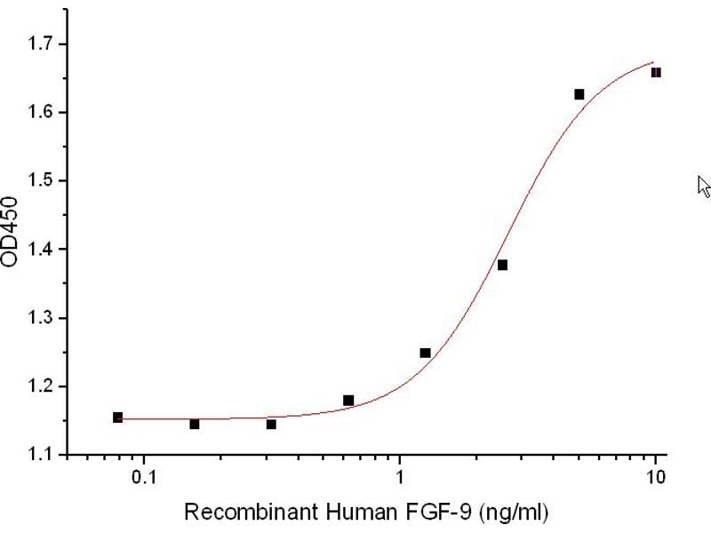 - Fibroblast Growth Factor 9 (FGF-9) belongs to the Fibroblast growth factor (FGF) family. FGF family members possess broad mitogenic and cell survival activities, and are involved in a variety of biological processes, including embryonic development, cell growth, morphogenesis, tissue repair, tumor growth and invasion. FGF-9 plays an important role in the regulation of embryonic development, cell proliferation, cell differentiation and cell migration. In addition, FGF-9 may have a role in glial cell growth and differentiation during development, gliosis during repair and regeneration of brain tissue after damage, differentiation and survival of neuronal cells, and growth stimulation of glial tumors.