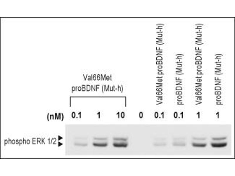 - Val66Met proBrain-Derived Neurotrophic Factor (Mut-human),Brain-derived neurotrophic factor (BDNF) is a neurotrophic factor that bind p75NTR as well as TrkB receptors1,2. BDNF supports the survival of many cell types3-8 and also modulates hippocampal plasticity and hippocampal-dependent memory in cell models and in animals9.The BDNF gene, like other peptide growth factors, encodes a precursor peptide (proBDNF), which is proteolytically cleaved to form the mature protein10. proBDNF has been shown to be a pro-apoptotic ligand for sympathetic neurons expressing both p75NTR and sortilin11, and to be involved in long-term potentiation (LTP) stage of the memory-related modifications in synaptic transmission12.A nonconservative single nucleotide polymorphism (SNP) in the human BDNF gene has been identified at nucleotide 196 (G/A) producing an amino acid substitution (Valine to Methionine) at codon 66 (Val66Met, rs 6265). Although located in the 5' pro-BDNF region, this SNP resulted in striking deficits in the cellular distribution and regulated secretion of the mature protein, BDNF and hence in corresponding alterations of human hippocampal function and episodic memory in vivo9.Egan MF. et al demonstrated the molecular mechanisms that control activity-dependent BDNF secretion and showed that depolarization-dependent secretion of BDNF in hippocampal neurons is significantly impaired when this Val66Met SNP occurs. Using double-staining techniques, they demonstrated that Val-BDNF-containing secretory granules are colocalized with synaptophysin, a marker for synapses. In contrast, Val66Met-BDNF aggregates are accumulated in the cell body and rarely colocalize with synaptophysin. This suggests that even if it can be secreted in small amounts near the cell body through the constitutive pathway, the Met-BDNF protein cannot be secreted at synapses9. Studies of heterozygote BDNF knockout rodents, who presumably have intermediate BDNF levels, demonstrate clear physiological13 and behavioral14 abnormalities, suggesting that secretion levels are critical.Multiple studies over the recent decades in humans, in vivo in animal models and in vitro found an association between the Val66Met polymorphism and bipolar and unipolar disorders15, Schizophrenia16,17, anxiety-related behavior18,19 and controversial association with ADHD20,21.The data emerged from the analysis of the Val66Met phenotype in various syndromes and diseases reveal the importance of the pro-region of the BDNF polypeptide, particular Valine66 and perhaps the nearby sequence, in intracellular trafficking and secretion of BDNF.