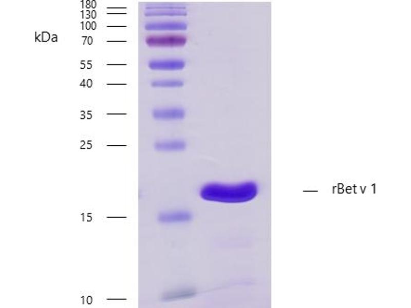- Recombinant protein rBet v 1 is expressed in Escherichia coli. DNA sequence encoding 172 AAs was fused with Strep-tag at the N-terminus. A calculated molecular mass of recombinant protein is 19 kDa.