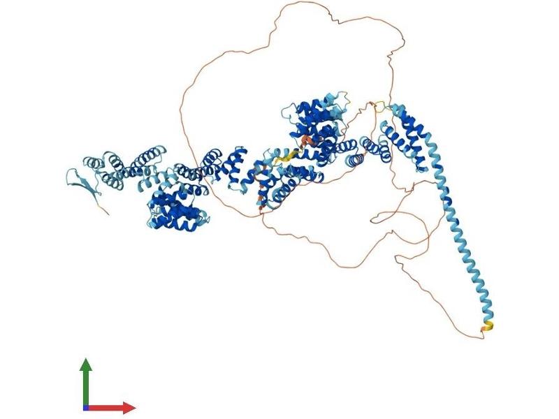 - RNA polymerase-associated protein CTR9 homolog (SH2 domain-binding protein 1),FUNCTION: Component of the PAF1 complex (PAF1C) which has multiple functions during transcription by RNA polymerase II and is implicated in regulation of development and maintenance of embryonic stem cell pluripotency. PAF1C associates with RNA polymerase II through interaction with POLR2A CTD non-phosphorylated and 'Ser-2'- and 'Ser-5'-phosphorylated forms and is involved in transcriptional elongation, acting both independently and synergistically with TCEA1 and in cooperation with the DSIF complex and HTATSF1. PAF1C is required for transcription of Hox and Wnt target genes. PAF1C is involved in hematopoiesis and stimulates transcriptional activity of KMT2A/MLL1, it promotes leukemogenesis through association with KMT2A/MLL1-rearranged oncoproteins, such as KMT2A/MLL1-MLLT3/AF9 and KMT2A/MLL1-MLLT1/ENL. PAF1C is involved in histone modifications such as ubiquitination of histone H2B and methylation on histone H3 'Lys-4' (H3K4me3). PAF1C recruits the RNF20/40 E3 ubiquitin-protein ligase complex and the E2 enzyme UBE2A or UBE2B to chromatin which mediate monoubiquitination of 'Lys-120' of histone H2B (H2BK120ub1), UB2A/B-mediated H2B ubiquitination is proposed to be coupled to transcription. PAF1C is involved in mRNA 3' end formation probably through association with cleavage and poly(A) factors. In case of infection by influenza A strain H3N2, PAF1C associates with viral NS1 protein, thereby regulating gene transcription. Required for mono- and trimethylation on histone H3 'Lys-4' (H3K4me3) and dimethylation on histone H3 'Lys-79' (H3K4me3). Required for Hox gene transcription. Required for the trimethylation of histone H3 'Lys-4' (H3K4me3) on genes involved in stem cell pluripotency, this function is synergistic with CXXC1 indicative for an involvement of the SET1 complex. Involved in transcriptional regulation of IL6-responsive genes and in JAK-STAT pathway, may regulate DNA-association of STAT3 (By similarity). {ECO:0000250|UniProtKB:Q62018, ECO:0000269|PubMed:16024656, ECO:0000269|PubMed:16307923, ECO:0000269|PubMed:19345177, ECO:0000269|PubMed:19952111, ECO:0000269|PubMed:20178742, ECO:0000269|PubMed:20541477, ECO:0000269|PubMed:21329879}.