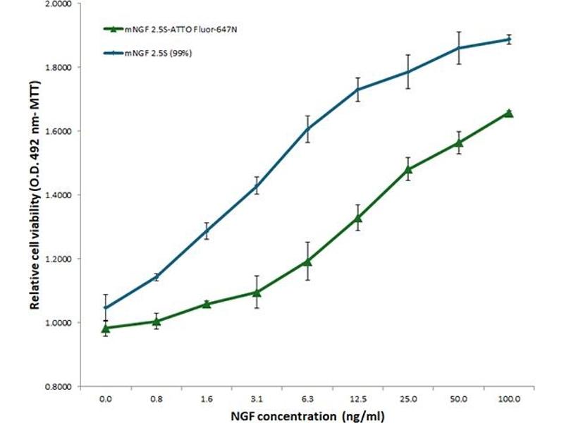 - Nerve Growth Factor 2.5S,The neurotrophins ("neuro" means nerve and "trophe" means nutrient) are a family of soluble, basic protein growth factors which regulate neuronal development, maintenance, survival and death in the CNS and PNS1. NGF, the first member of the family to be discovered, was originally purified as a factor supporting and regulating survival, development, function and plasticity of sympathetic and sensory spinal neurons in central and peripheral nervous systems in vivo as well as in vitro2-4. It is synthesized and secreted by sympathetic and sensory target organs and provides trophic support to neurons as they reach their final target5. Neurotrophin secretion increases in the nervous system following injury. Schwann cells, fibroblasts, and activated mast cells normally synthesize NGF constitutively, however, direct trauma and induction of cytokines combine to increase neurotrophin production in these cells after injury6. NGF is purified in three forms: the 7S, 2.5S and β, in which the biologically active subunit is the β subunit. The structural hallmark of all the neurotrophins is the characteristic arrangement of the disulfide bridges known as the cysteine knot, which has been found in other growth factors such as Platelet-derived growth factor7. Additionally, the involvement of NGF was recently discovered in processes such as asthma8, psoriasis9 and wound healing10. The biological effects of NGF are mediated by two receptors: TrkA, which is specific for NGF, and p75NTR, which binds all the neurotrophins11. For the past three decades, biotinylated derivatives of NGF have been widely used in the literature as useful probes for the study of the binding and the initial intracellular processing of this growth factor by cells bearing TrkA NGF receptor12. First studies using 125I-NGF have visualized the intracellular location of NGF12. A biotinylated derivative of NGF that retains biological activity, in conjunction with the appropriate avidin conjugates and fluorescent or confocal microscopic techniques, improve the sensitivity and resolution in many applications. Some examples of applications are: targeting of liposomes containing biotinylated NGF to cells bearing TrkA NGF receptors13, elucidating the kinetics and route of ligand-induced internalization of the p75 receptor through signaling endosomes in cycling and differentiated PC12 cells using biotinylated derivative of NGF14, electrically controlled NGF-Biotin delivery from biotin-doped conductive polymer15, studying the retrograde axonal transport mechanism of NGF signals from the axon terminal to the cell body16,17.