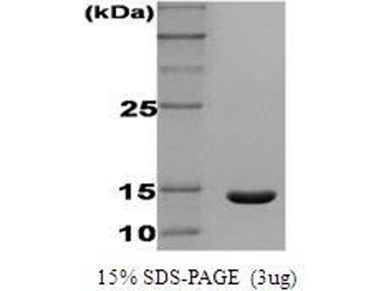 Human interferon-gamma (hIFN-gamma) is secreted by lymphocytes stimulated by mitogen and is involved in the differentiation, maturation, and proliferation of hematopoietic cells. Natural human interferon-gamma is composed of 143 amino acid residues without cysteine residues and is glycosylated. Recombinant human interferon-gamma was expressed in E. coli and purified by FPLC gel-filtration chromatography, after refolding of the isolated inclusion bodies in a renaturation buffer. Additional amino acid (Methionine) is attached at N-terminus.