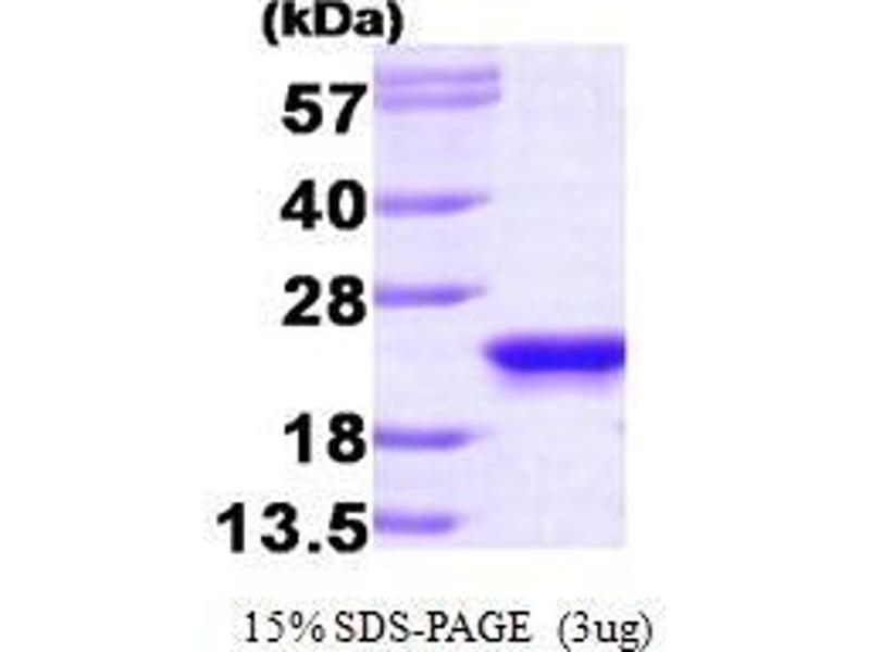 Phosphatidylethanolamine binding protein 1 (PEBP1), also known as Raf kinase inhibitor protein (RKIP), is a member of the phosphatidylethanolamine-binding protein family and a serine protease inhibitor which inhibits thrombin, neuropsin. PEBP1 plays a pivotal modulatory role in several protein kinase signaling cascades. Protein kinase C (PKC) phosphorylates PEBP1, resulting in release of Raf-1 and activation of MEK and ERK. Expressed in many tissues, PEBP1 is implicated in the regulation of such physiological processes as membrane biosynthesis, spermatogenesis, neural development, and metastasis suppression. Recombinant human PEBP1 was expressed in E. coli and purified by using conventional chromatography techniques.