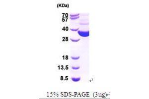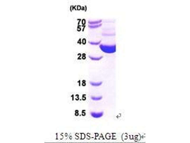 TRXB(Thioredoxin reductase) is a ubiquitous enzyme which is involved in many cellular processes such as cell growth, p53 activity, and protection against oxidative stress. The mammalian Thioredoxin reductase reduces thioredoxins as well as non-disulfide substrates such as selenite, lipoic acids, lipid hydroperoxides, and hydrogen peroxide. Recombinant E. coli TRXB protein was expressed in E. coli and purified by using conventional chromatography techniques.