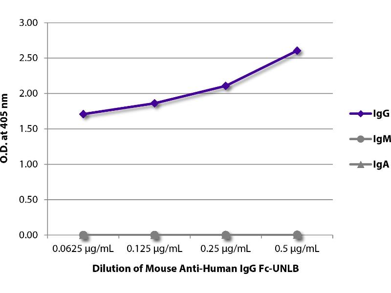 Reacts with the Fc portion of the heavy chain of all subclasses of human IgG as demonstrated by ELISA.