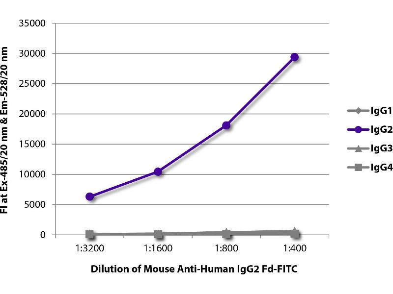 - Reacts with the Fd portion of the heavy chain of human IgG2 as demonstrated by ELISA