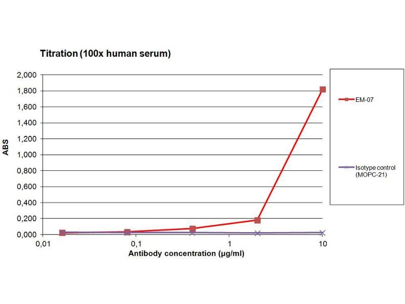 - Western blotting and ELISA: The peroxidase conjugate of this antibody is suitable for detection of human IgG Fc fragments. The antibody EM-07 does not crossreact with IgM.
