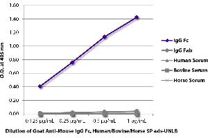 - Goat IgG Fc Minimal reactivity to goat IgG Fab and sheep, rabbit, human, monkey, rat, hamster, canine, and swine IgG