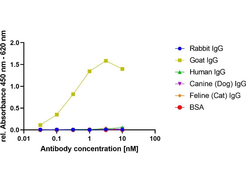- No known cross reactivity. No cross reactivtiy to rabbit IgG, human IgG, dog IgG, cat IgG. Other species were not tested.