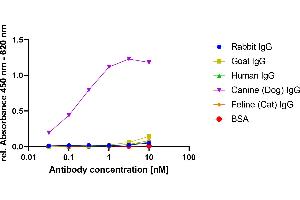 - This antibody reacts with whole dog IgG as determined by ELISA techniques. This antibody does not cross react with IgG from rabbit, human, goat or cat. Anti-Canine monoclonal antibodies are affinity-purified antibodies with well-characterized specificity for canine immunoglobulins and are useful in the detection, sorting or purification of its specified target. This antibody can be detected with anti-mouse Fc secondary antibodies.