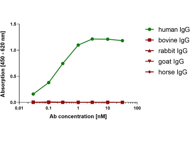 - No known cross reactivity. No cross-reactivity to human IgM, human IgE, human IgA, mouse IgG, rabbit IgG, horse IgG, bovine IgG, goat IgG, rat IgG, dog IgG, cat IgG. Other species were not tested.