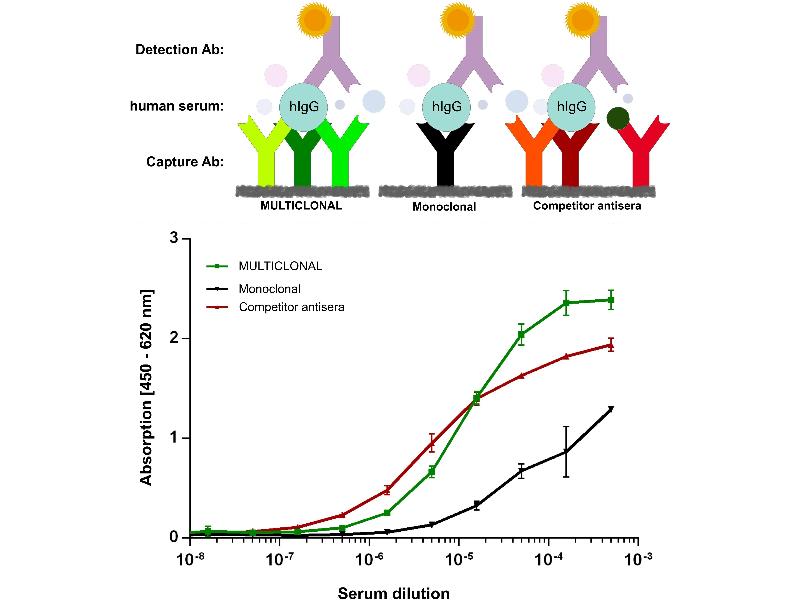 - Multiclonals are recombinant secondary antibodies that combine the best of polyclonal antisera and hybridoma monoclonal antibodies, while eliminating their disadvantages, plus they add the quality of recombinant reagents. Multiclonal antibodies consist of carefully adjusted mixtures recognizing different epitopes on all four different subclasses of human IgG. Their respective epitope binding sites do not compete with each other, therefore amplifying signal strengths. Multiclonals can contain up to 17 different individually tested monoclonal recombinant antibodies. This provides the typical advantage of polyepitope recognition which is key to the broad application profile of polyclonal antisera, but eliminates their disadvantages (limited batch sizes and batch-to-batch variations, no long-term reproducibility, undefined composition, unknown constituents). Multiclonals are completely sequence defined, implying their unlimited long-term availability and always identical test results. Their composition of individually characterised antibodies minimizes cross-reactivity with other targets, since they do not contain non-target directed IgG like all animal derived polyclonals do. This allows for a much lower unspecific binding reactivity in many assays compared to animal based products.