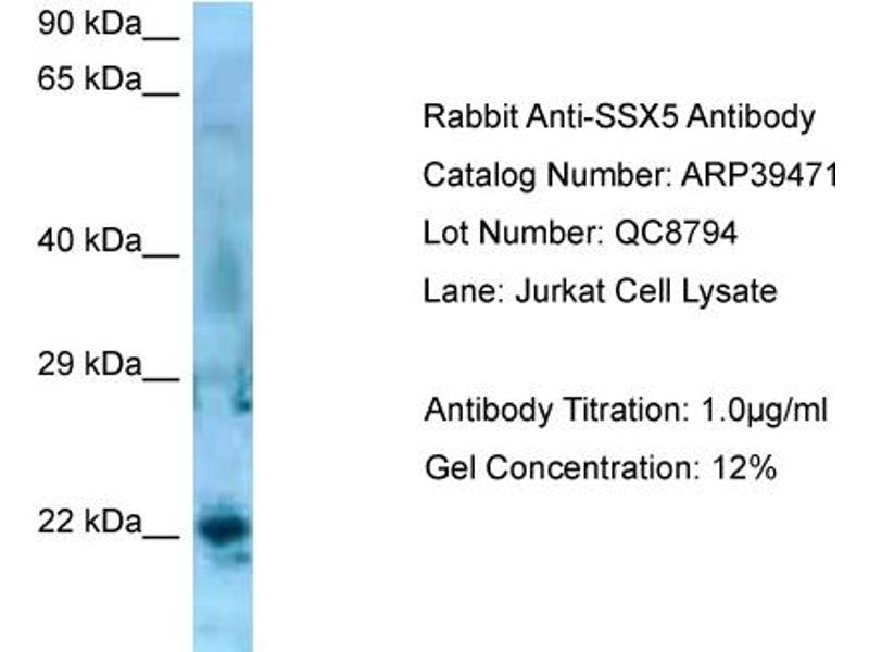 : "Expression and immunotherapeutic targeting of the SSX family of cancer-testis antigens in prostate cancer." in: Cancer research, Vol. 71, Issue 21, pp. 6785-95, (2011) (PubMed).Aliases for SSX5 Antibodies