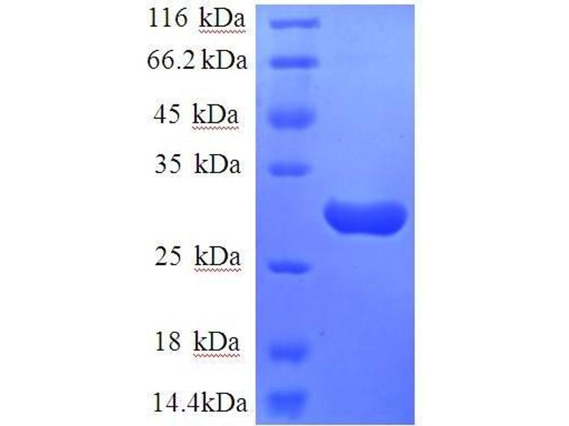 The purity of the protein is greater than 90 % as determined by SDS-PAGE and Coomassie blue staining.