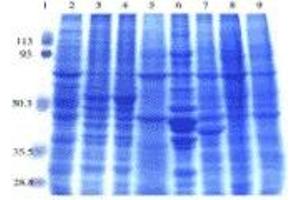 Samples loaded: Lanes: 1: protein markers, 2: rat rat adrenal, 3: cerebellum, 4: cerebrum, 5: small intestine, 6: skeletal muscle, 7: stomach, 8: testis, and 9: thymus